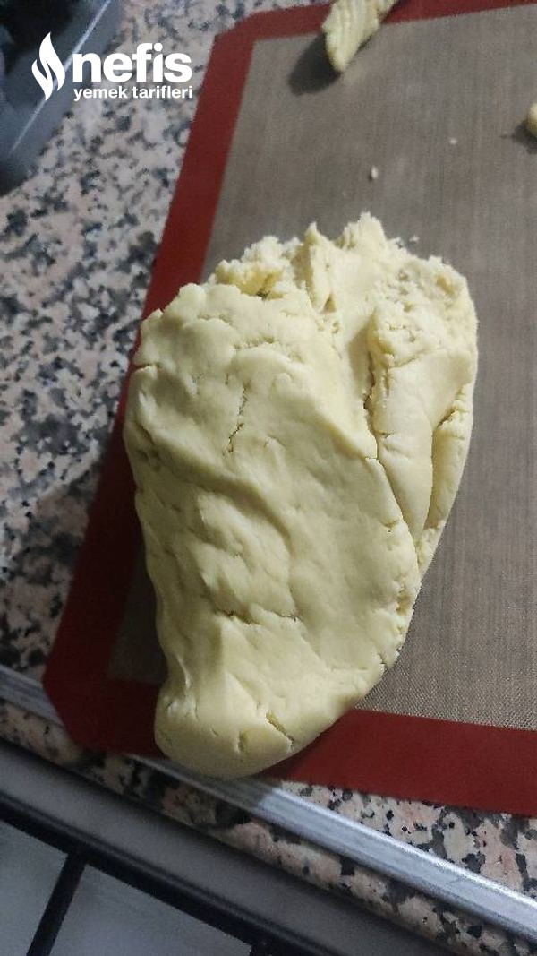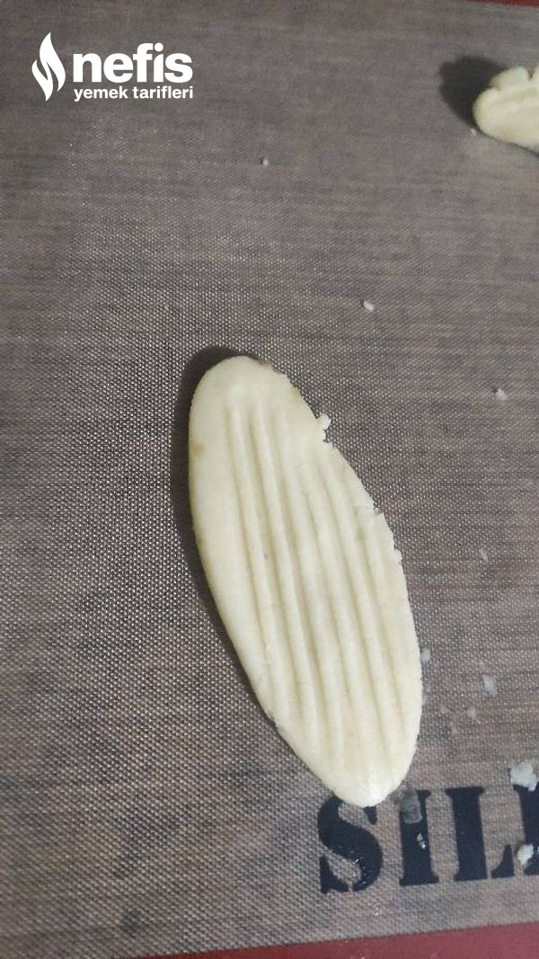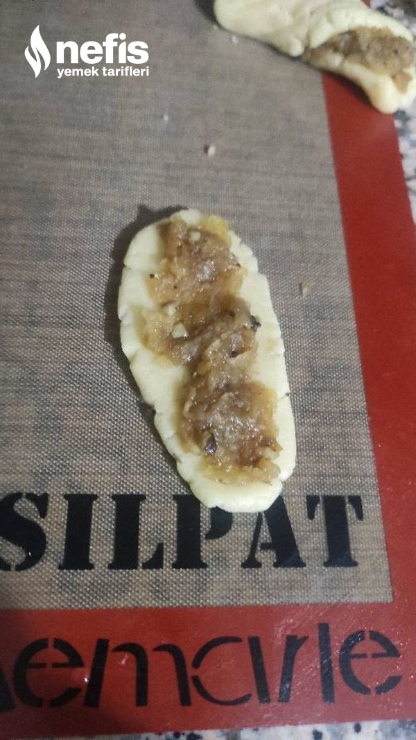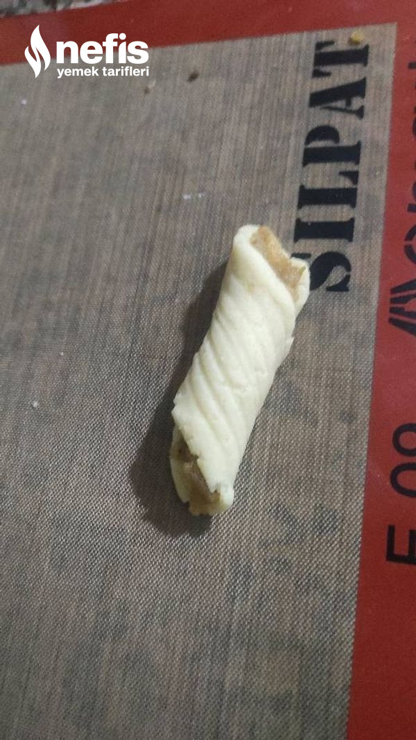 6. Hamuru tezgaha alıp ceviz büyüklüğünde kesimler koparıp yuvarlayın elinizle uzun silindir halinde büyütün üzerini çatal ile geçip hal verin aykırı çevirip elmalı harçtan koyun sarmal formda çevirin yay formunda.