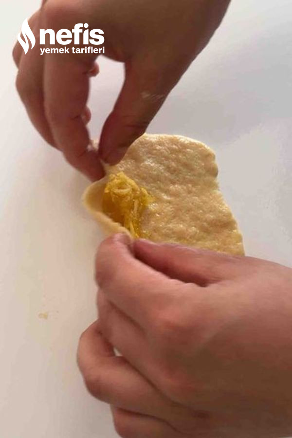 4. Hamurdan küçük modüller koparıp, evvel yuvarlak formda açalım, elimizle daha sonra içine elmalı harcı ekleyelim ve ikiye katlayalım.