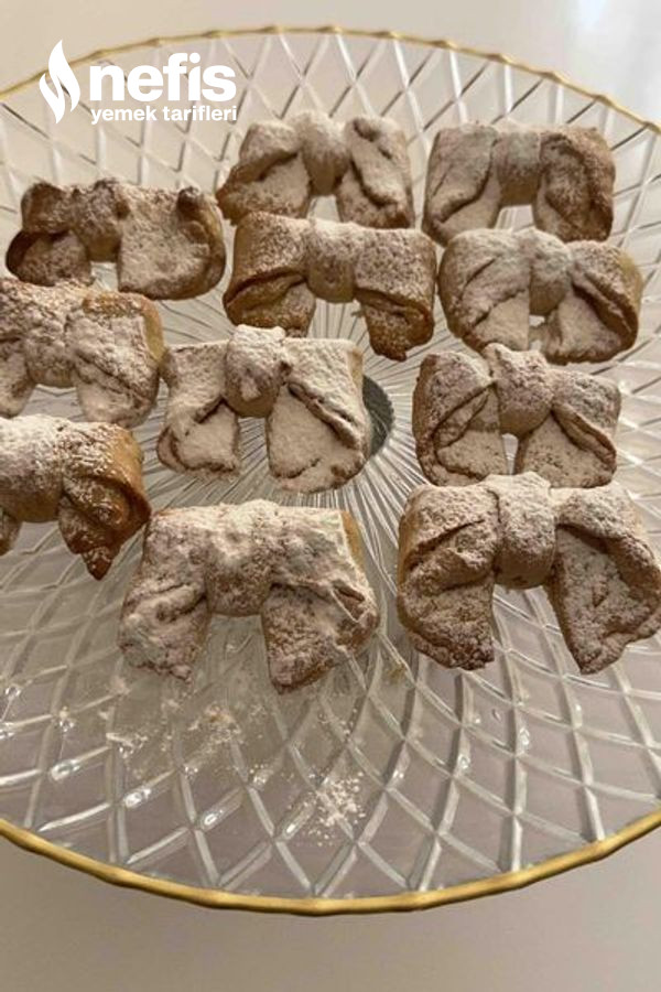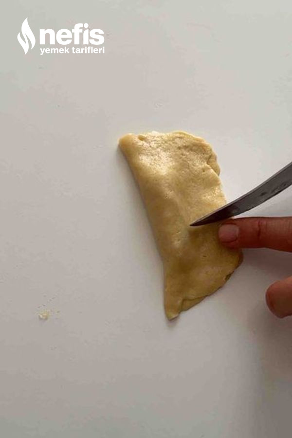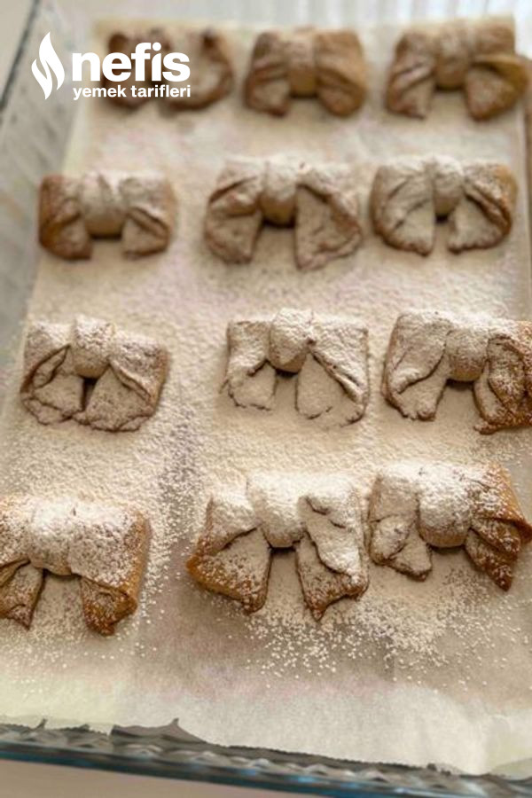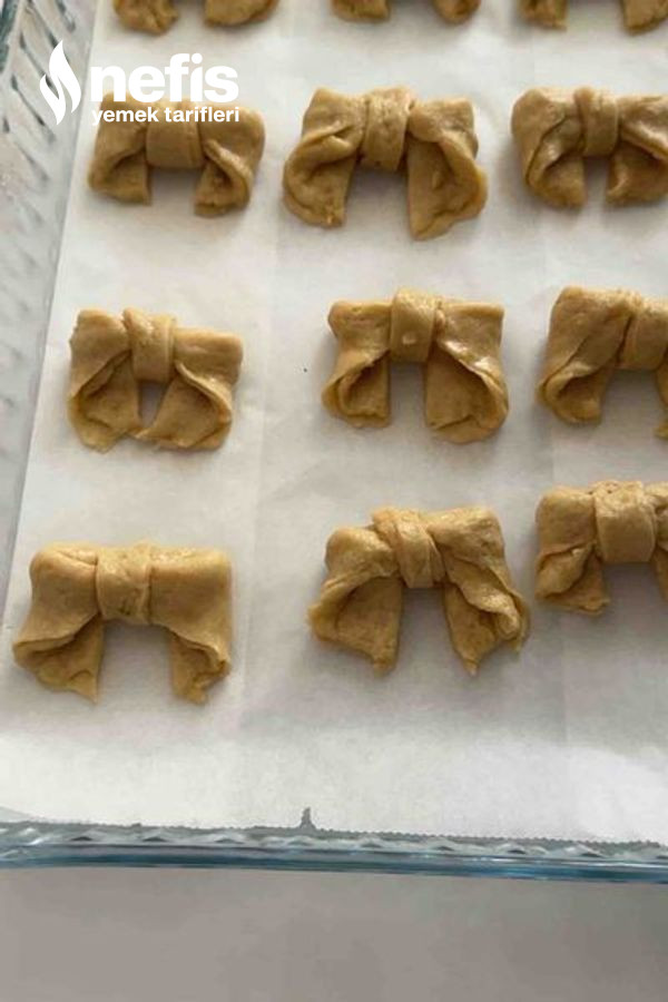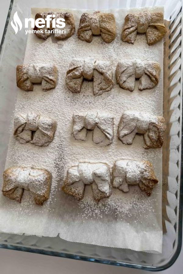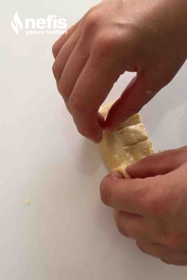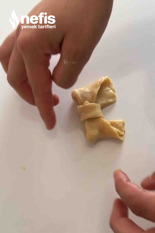 5. Katladıktan kenarlarından hafif katlayalım, sonra hamurun iki ucunun üst üste geldiği kısımda iki kesik atalım ve fiyonk formunda katlayalım.