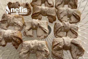 5. Katladıktan kenarlarından hafif katlayalım, sonra hamurun iki ucunun üst üste geldiği kısımda iki kesik atalım ve fiyonk formunda katlayalım.