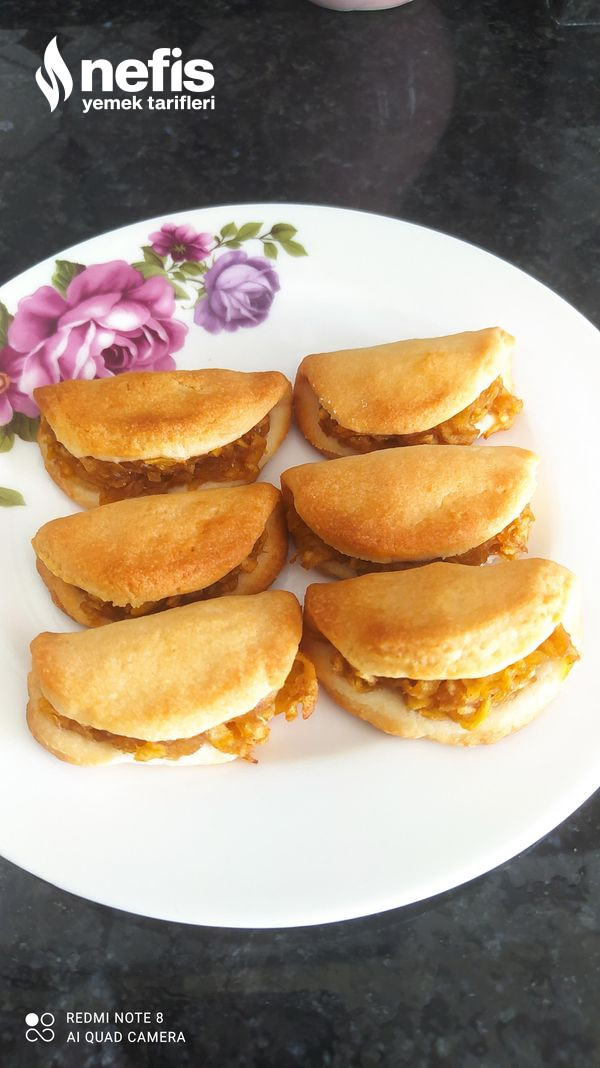 - Hamuru bezelere ayırın her bezeyi merdane ile açıp üçgenler (pizza dilimi gibi) kesin geniş tarafına elmalı harç koyup sarın ya da klasik kapalı “yarım ay kurabiye” biçimi verebilirsiniz.