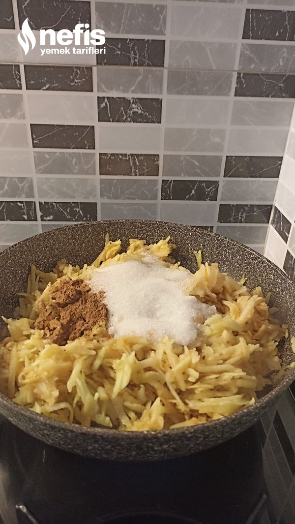 1. İlk olarak elmaları soyup rendeleyin tavaya şeker ve tarçını ekleyelim, elmalar suyunu çekene kadar pişirelim, 5-6 dakika kadar ocaktan alıp soğumaya bırakıyoruz.
