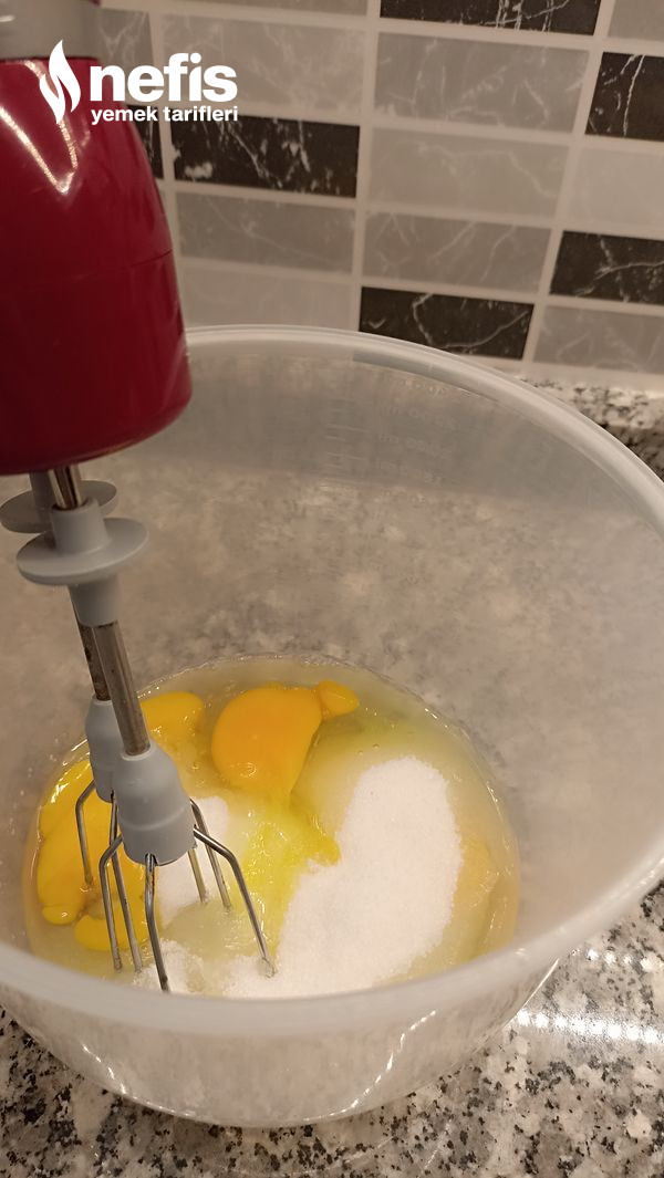 2. Yumurta ve şekeri beyazlaşana kadar çırpıp sütü ekleyelim.