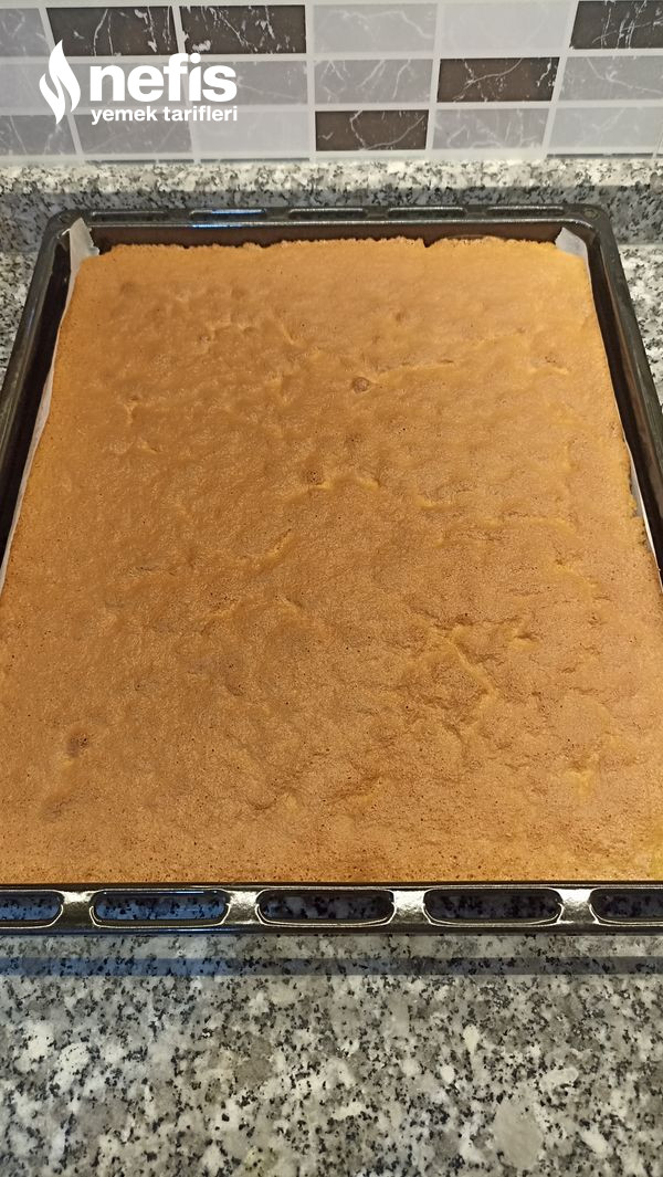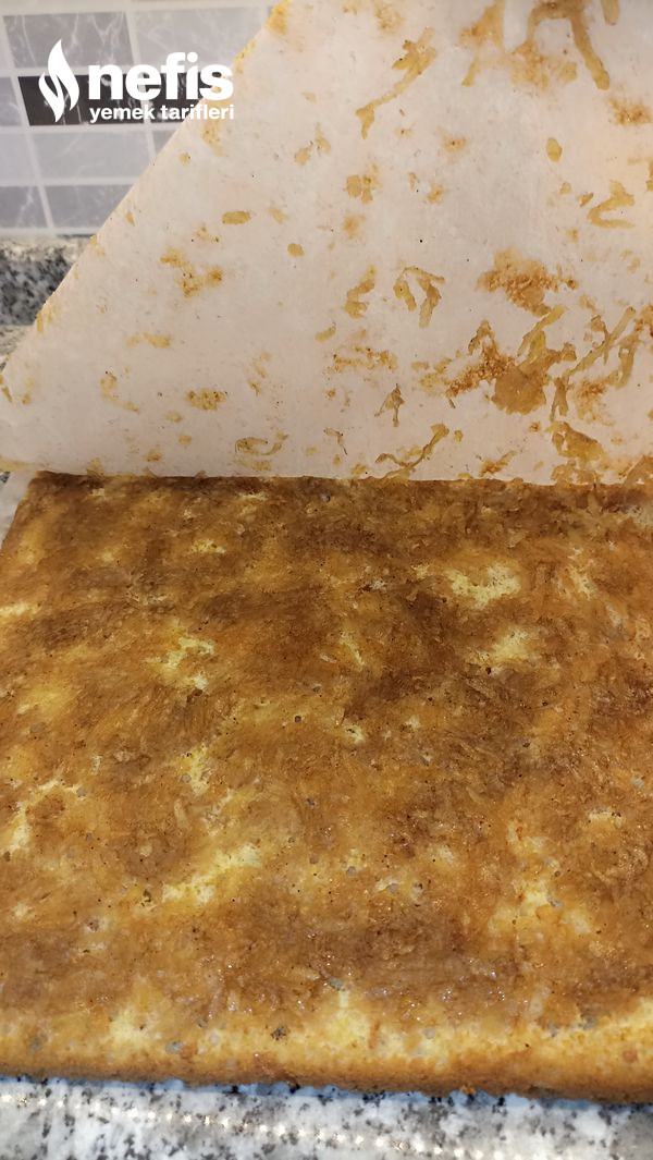 5. Pişen kekin üzerine yağlı kağıt açıp karşıt çevirelim üzerindeki kalan yağlı kağıdı çıkaralım.
