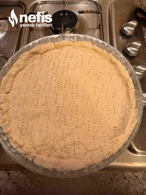 - Borcama aldığınız tabanı elinizle düzelttikten sonra bir çatal yardımı ile delikler açın ve en son soğuttuğunuz iç harcı şerbeti ile birlikte hamura dökün.