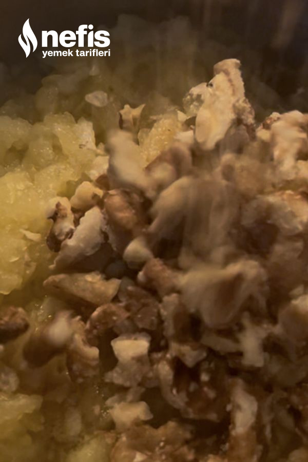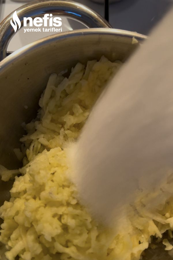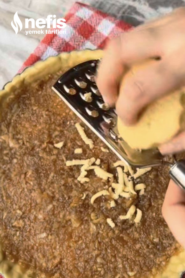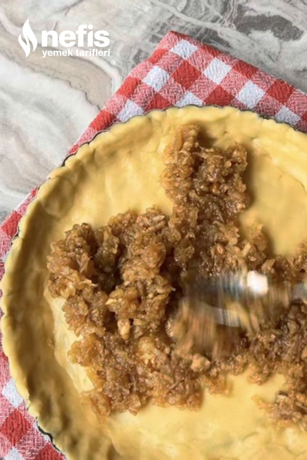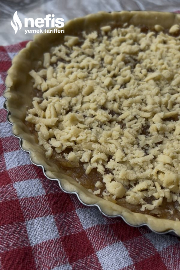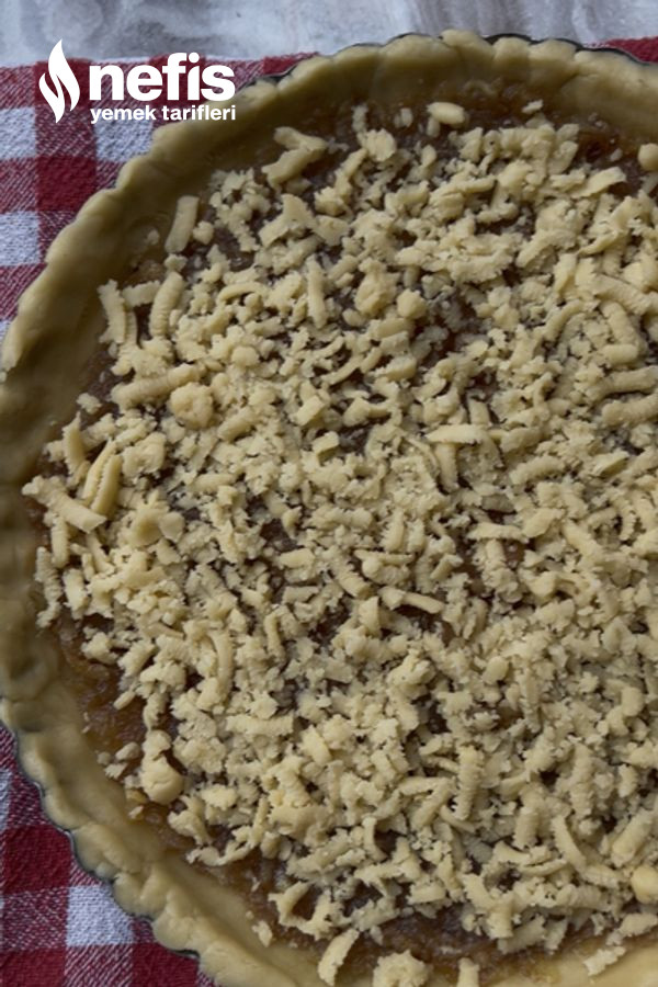 7. Tart kalıbımıza hamuru yayalım üzerine elmalı harcı koyup öbür hamuru rendeleyelim.
