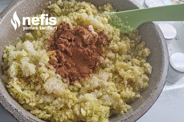 - Önce iç harcı hazırlayalım. Elmaları rendeleyip tavaya alalım.