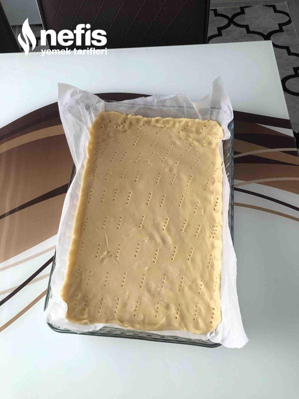 - Hamurdan biraz koparıp poşete koyup buzdolabına kaldıralım kalan hamuru dikdörtgen borcama yayalım ,düzleyelim.