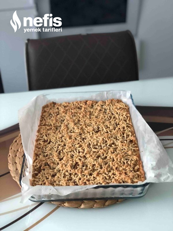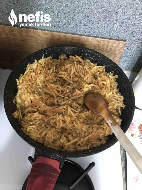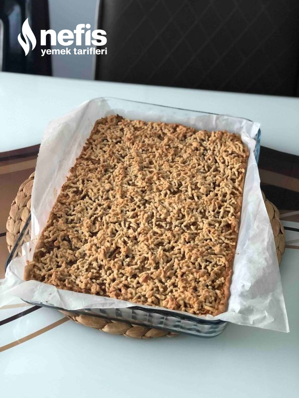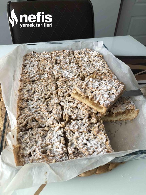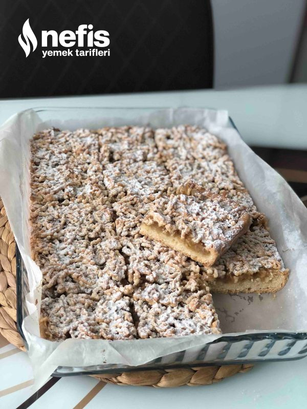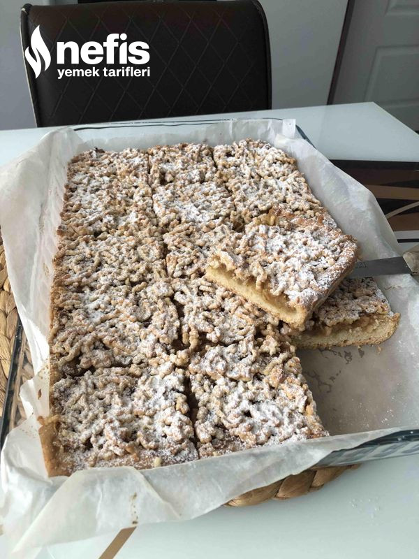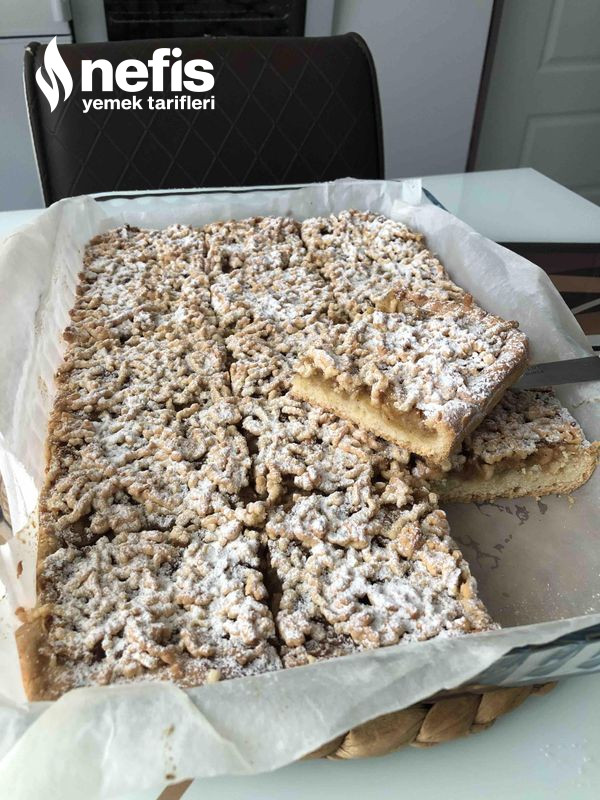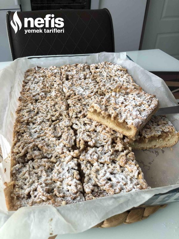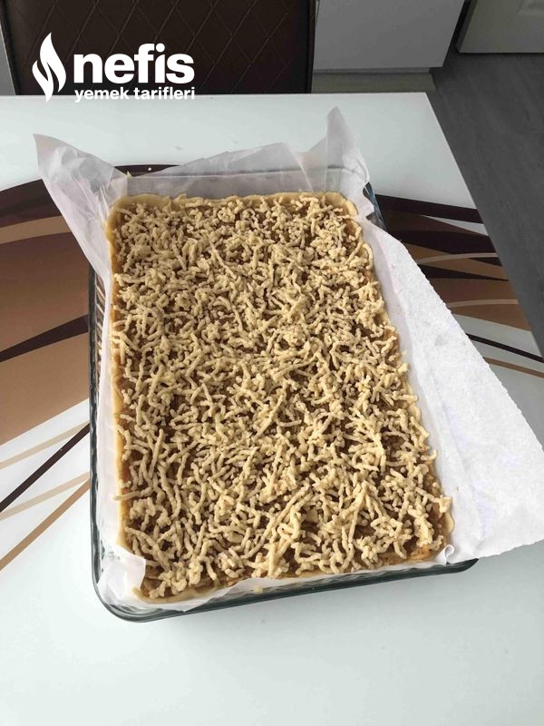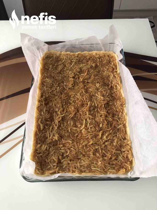 - Çatalla delikler açalım âlâ pişsin diye üzerine elma harcı dökün yayın, elmalın üstüne kalan hamuru rendeyle rendeleyelim yahut dilerseniz merdaneyle açıp kesip şeritler halinde biçimde yapabilirsiniz.
