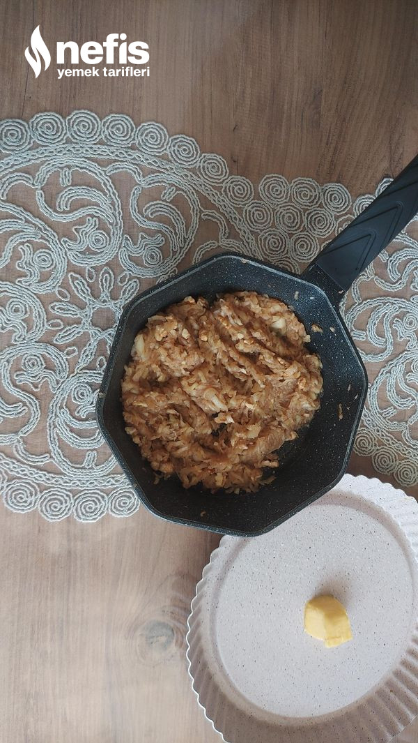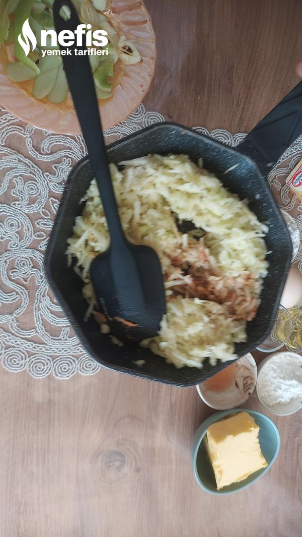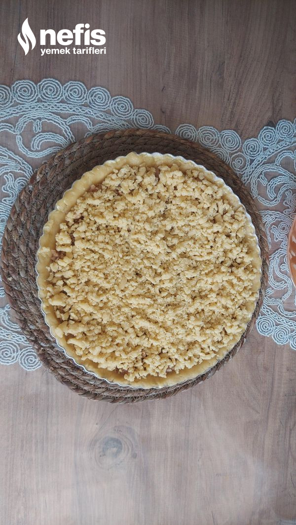 - Her tarafına düzgün bir formda kenarlarına kadar çıkartalım tam ortasına soğumuş olan elmalı iç harçtan dökerek yayalım, buzlukta bekleyen hamuru rendeleyelim her tarafına eşit yayalım.