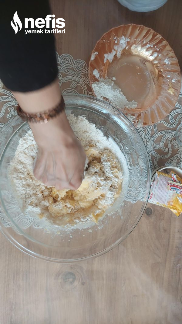- Sırasıyla bütün gereçleri yoğurma kabına alalım, elimizle karıştırarak azar azar un eği yapıp kulak göğsü kıvamında bir hamur yoğuralım.