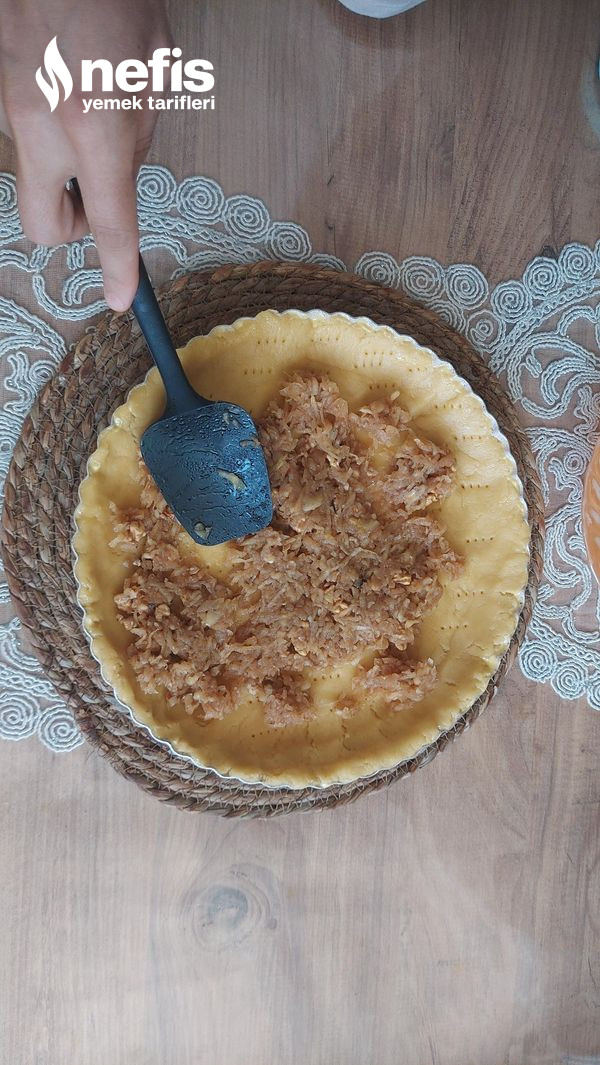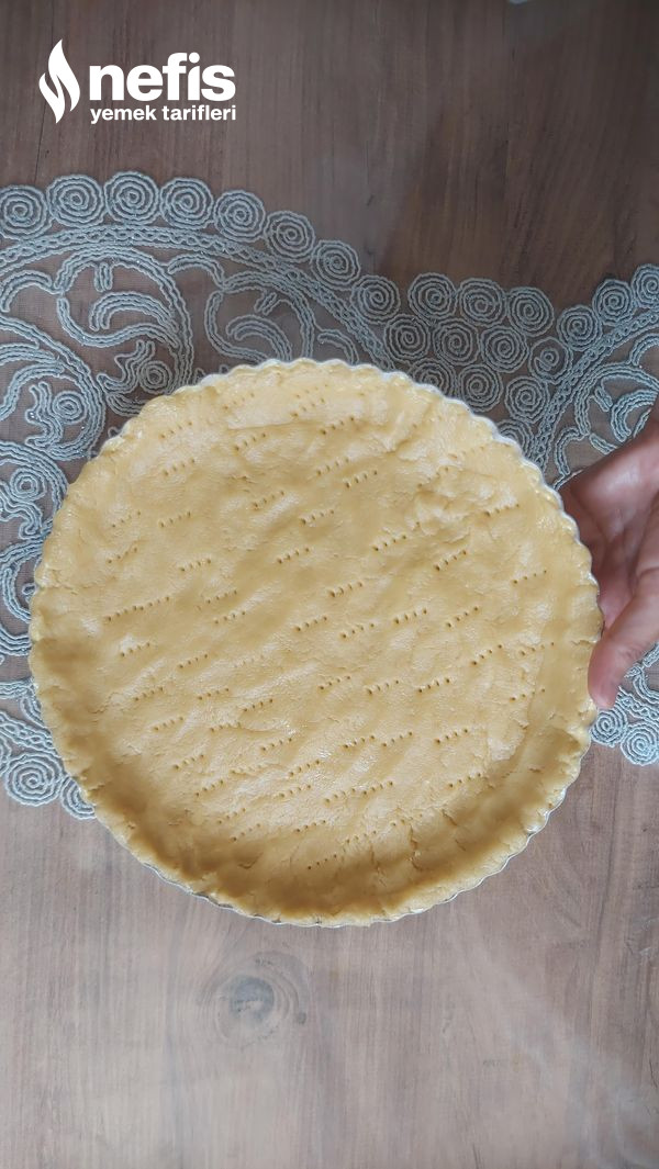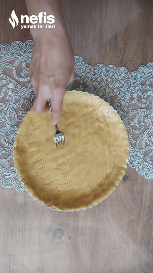 - Kalan başka hamuru tart kalıbı ya da yuvarlak küçük uzunluk tepside kullanabilirsiniz tabanını kalan hamuru tepsiye yayalım. Çatalla delikler açalım.