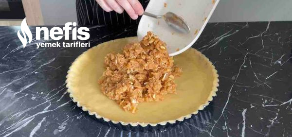 - Soğuyan elmalı harcı hamurun üzerine yayıp düzleştirelim.