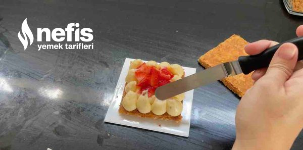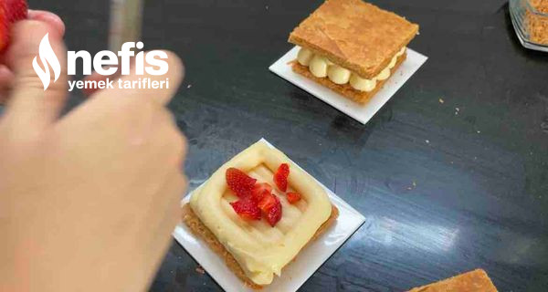 - Hazırladığımız kremamızı bir sıkma torbasını alalım ve birinci modül hamurum üzerine krema sıkarak çilek dolduralım üzerine çok az bir şey daha krema koyup, başka kat milföy hamuru da üzerine kapatıp en son üstlerine pudra şekeri serperek ve çilekle süsleyerek servis edelim.