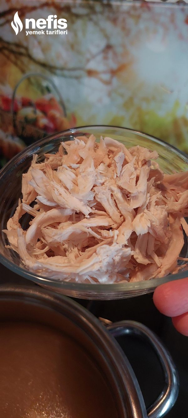 - Tavuğu haşlayıp güzelce didikliyoruz. Yada benim üzere daha evvel haşladığınız bütün tavuktan 1 küçük kase ayırıp sonra diğer gün çorbada kullanabilirsiniz.