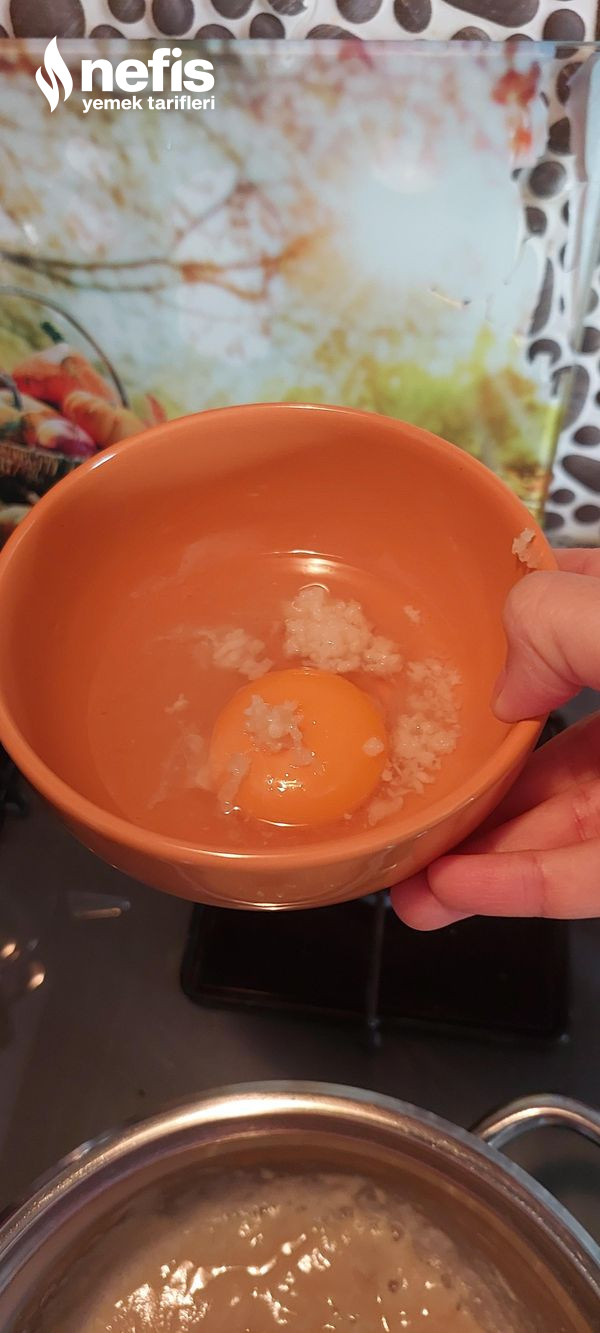 - O kaynayana kadar küçük bir kasede yumurta sarısı yarım limon suyu ve sarımsakları ezip karıştırıyoruz.