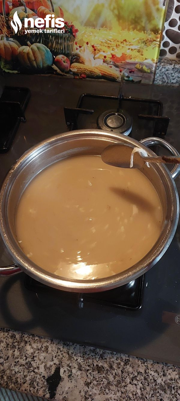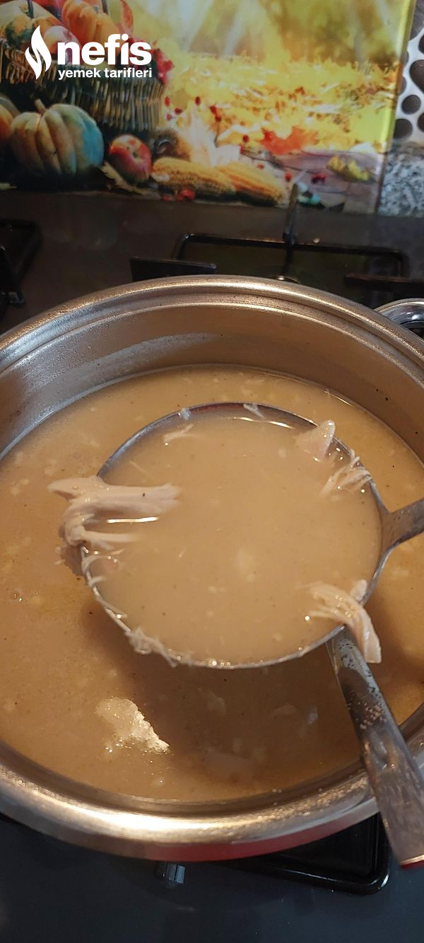 - Unun kokusu çıkınca 5 bardak tavuk suyunu koyuyoruz akabinde didiklenmiş tavukları ekleyip ortada karıştırarak kaynamasını bekliyoruz.