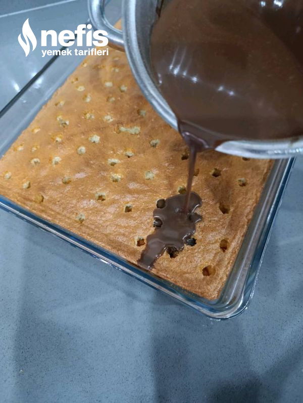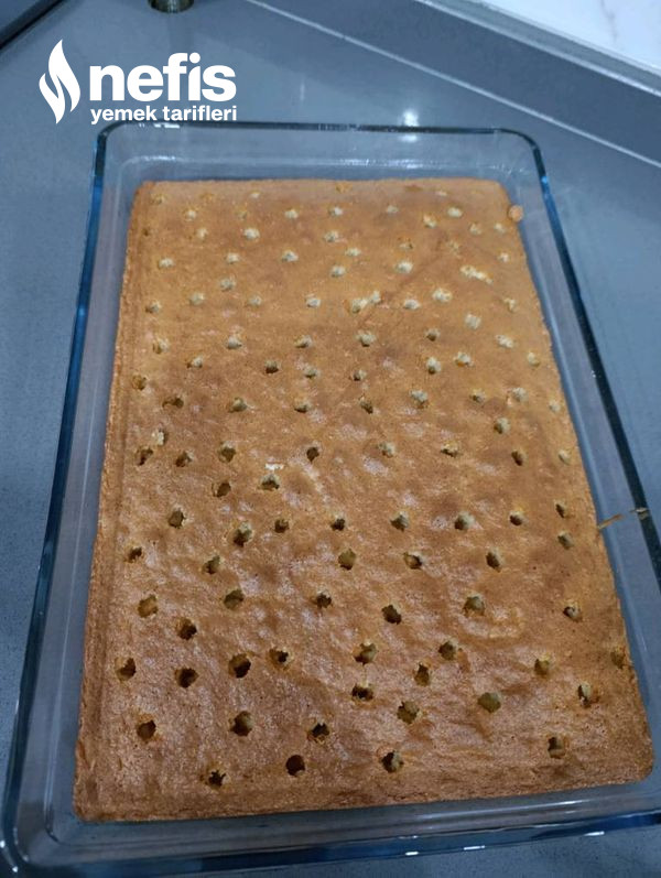 5. Pişen keki fırından alıp 10 dakika bekliyoruz ve pipet yardımıyla kekin üzerine delikler açıyoruzki sos içine işlesin.