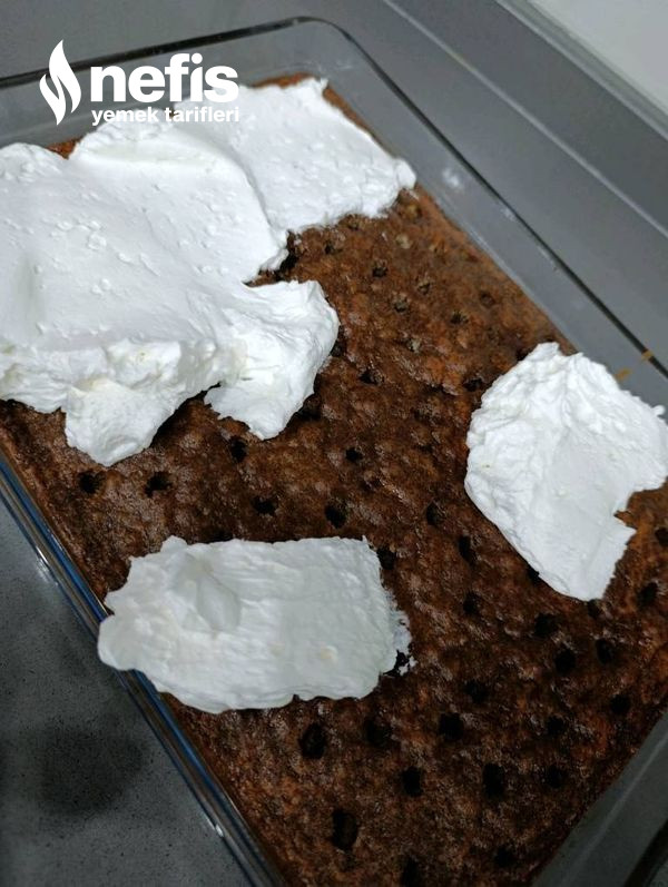 7. Krem şantiyi bir şu bardağı soğuk sütle düzgünce köpürtüp kekin üzerine yayıyoruz.