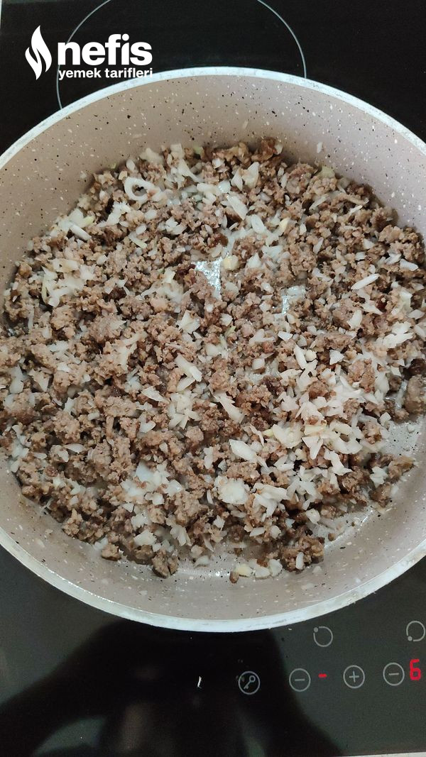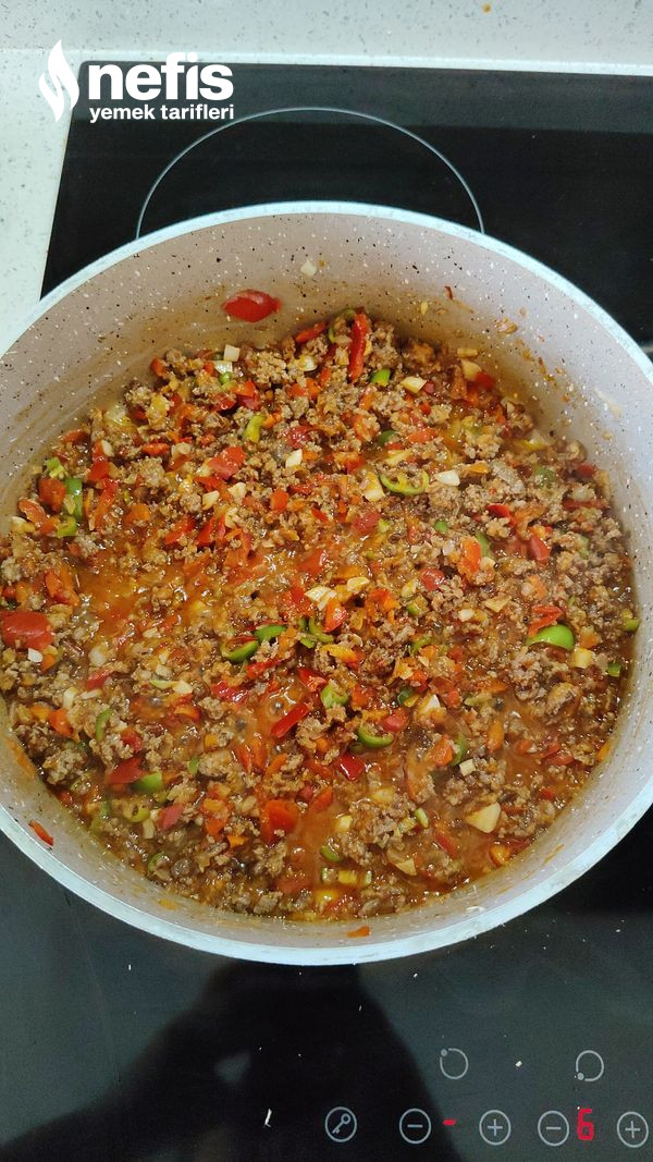 3. Kavrulan kıymaya soğanları ek edip soğanlar pembeleşinceye kadar kavurmaya devam ediyoruz, akabinde sırayla biberler, sarımsak, domates, ve baharatları ekleyip daima birlikte kavuruyoruz.
