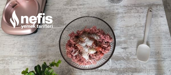 - İç materyali için bir kapta kıymalı harcı karıştıralım ve hamuru açana kadar buzdolabına kaldıralım.