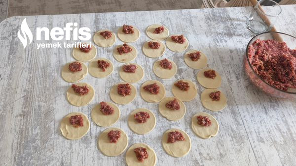 - Kesmiş olduğumuz hamurların içerisine bir tatlı kaşığı kıymalı harcı koyalım.