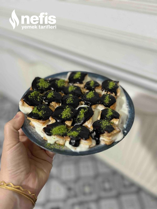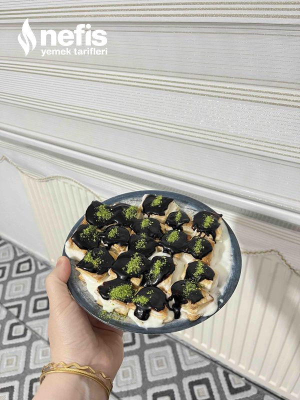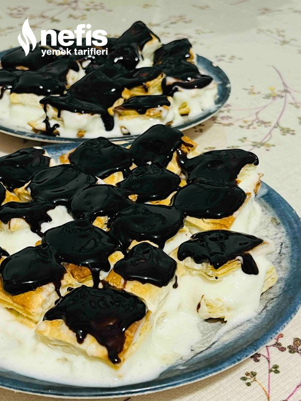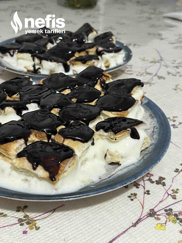 6. Kızartıp soğuttuğumuz milföy hamurların ortalarına açıp içerisine muhallebilerimizi taşırmadan koyuyoruz ve servis edeceğimiz sabahı alıyoruz en son üzerine çikolata sosumuzda dilediğinizce dökerek süsleyip servise hazır ediyoruz.