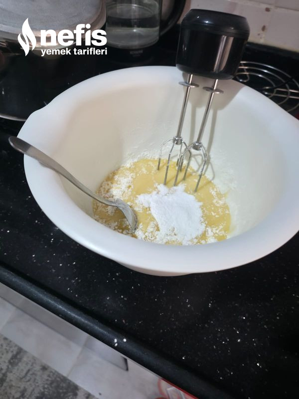 2. 1 su bardağı sıvı yağı ve 1 su bardağı nişastayı ekleyip mikser yardımıyla çırpalım.