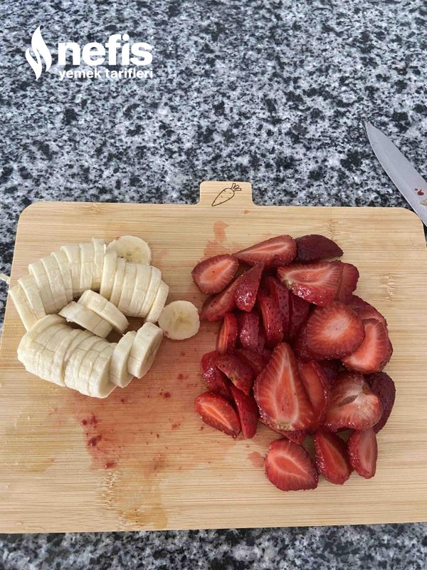 5. Çileklerimizi ve muzlarımızı güzelce ister küp ister dikey olacak çekilde uzun olarak da kesebilirsiniz.