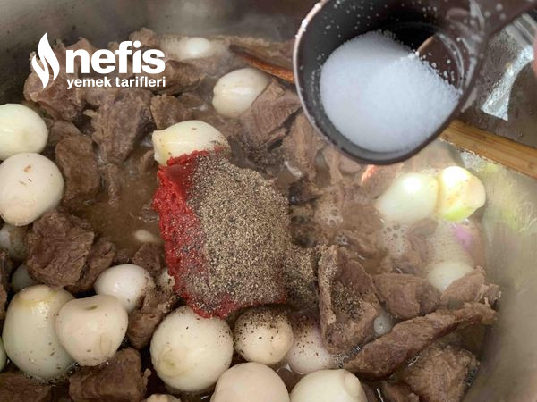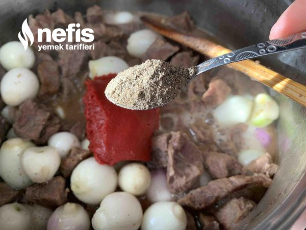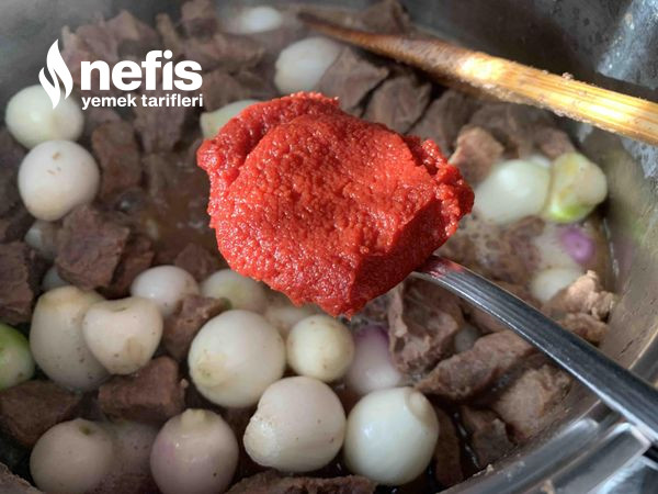 - Yumuşayan etlere domates salçası,arpacık soğan,sarımsak,sirke,tuz,karabiber ve defne yaprağını atıp karıştıralım.