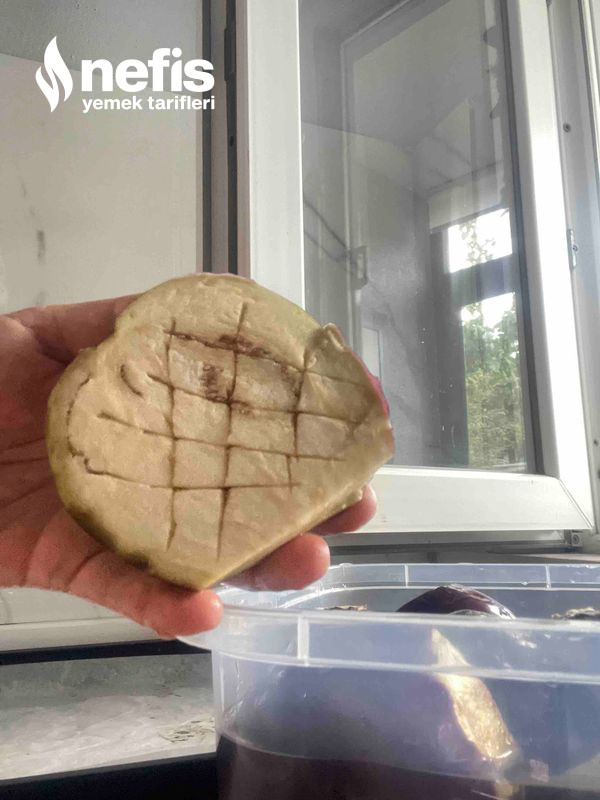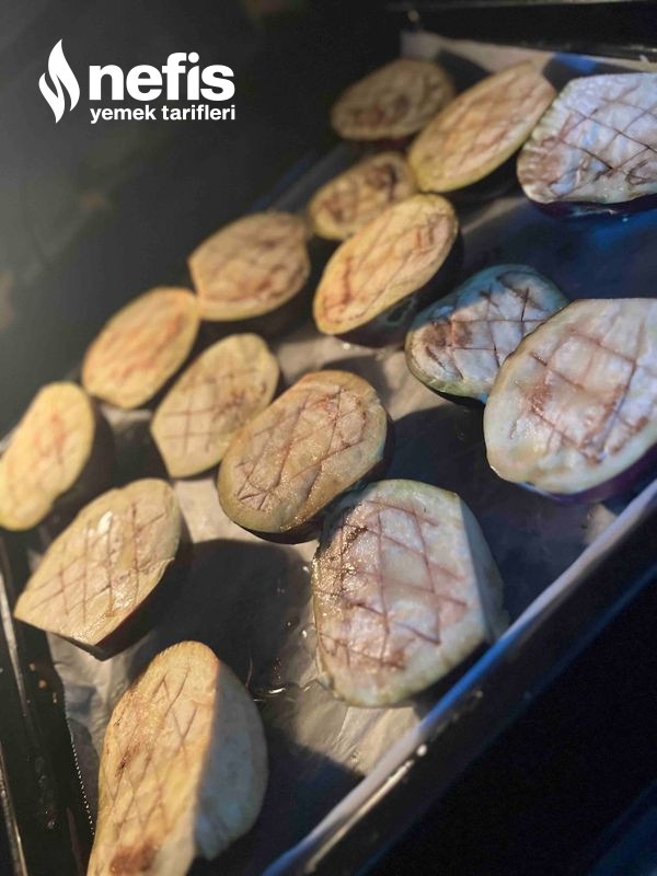 2. Acı suyu çıkan patlıcanlarımızın orta kısımlarını baklava dilimi üzere bıçakla yavaşça çizerek tepsimize alalım.