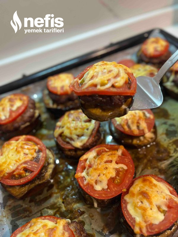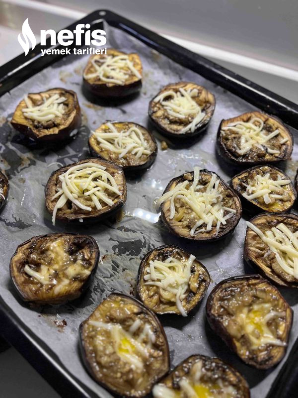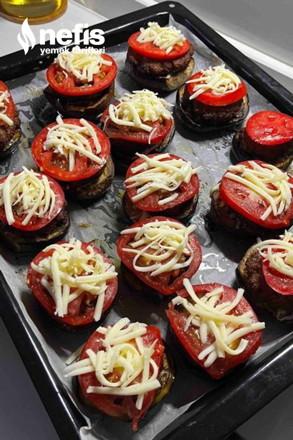 8. Son olarak ince domates dilimleri ve kaşar peyniri rendesi serpiştirip 200 derece fırına verelim.