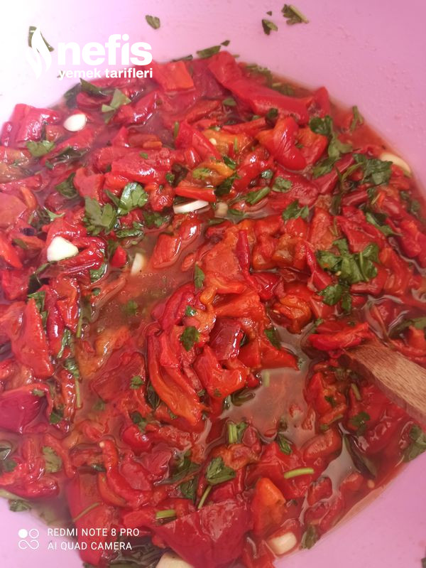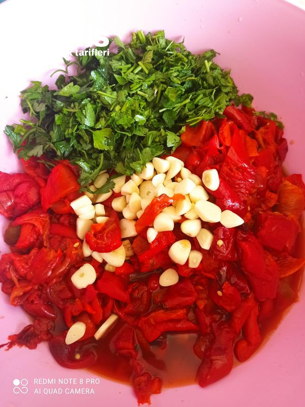1. Biberleri fırında közleyin ve kabuklarını soyun istediğin halde doğra ,bir kaba alın.