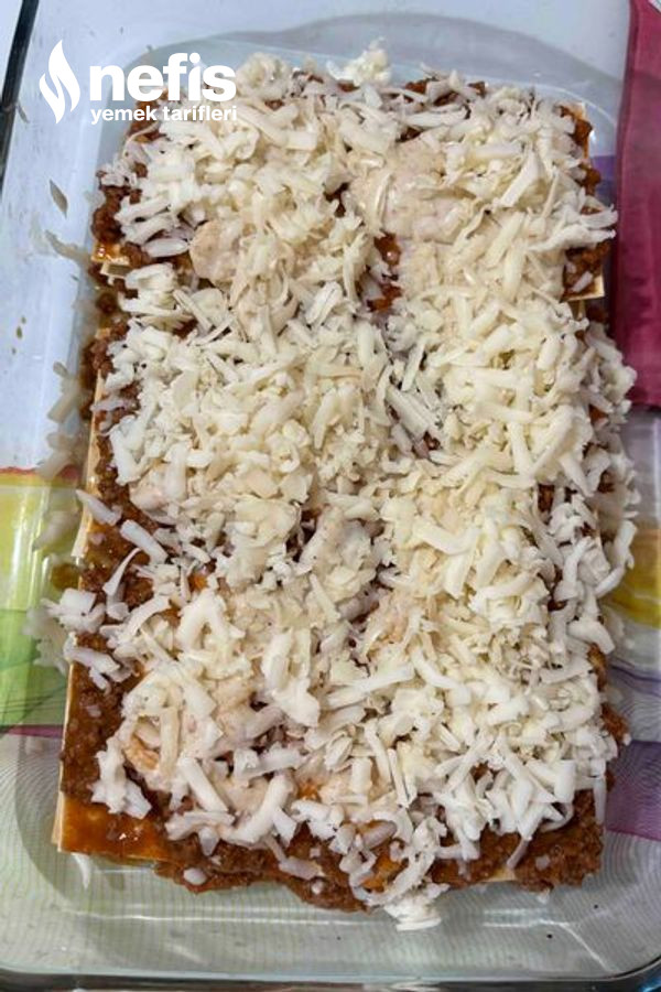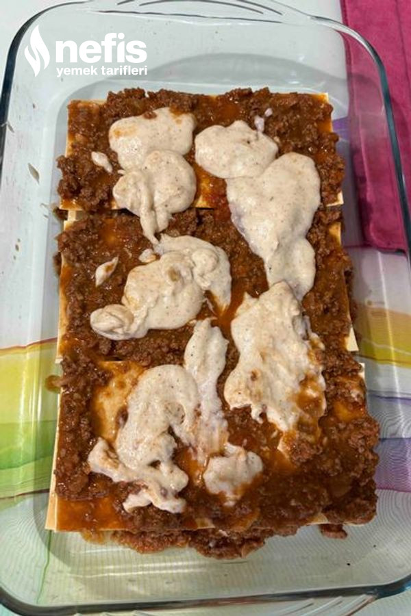 - Isıya sağlam bir kaba evvel iç harçtan sonra da beşamel sostan konur ve üzerine lazanyalar yan yana dizilir.