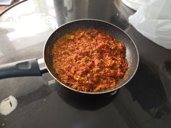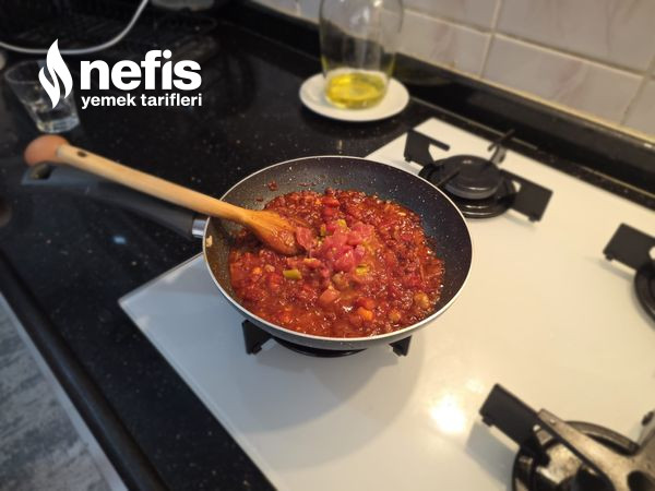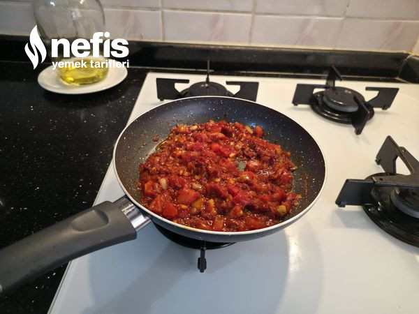 - Salçamız biraz kaynadıktan sonra küp küp dilimlenmiş domatesimizi ve menemenlik sosumuzu ek edelim ve kavurmaya devam edelim (ben kendim yaptığım kışlık menemen sosumu kullandım. Lakin sizler isterseniz marketten domates püresi alıp kullanabilirsiniz)