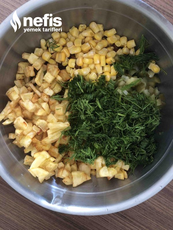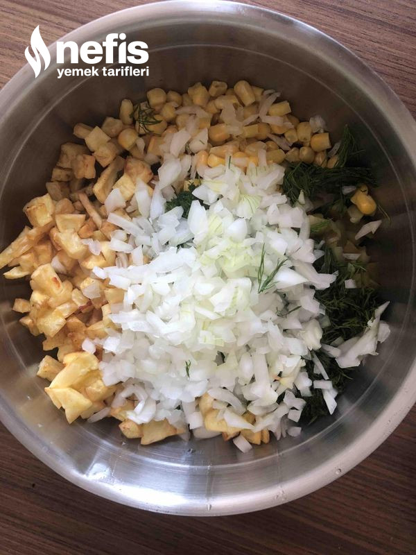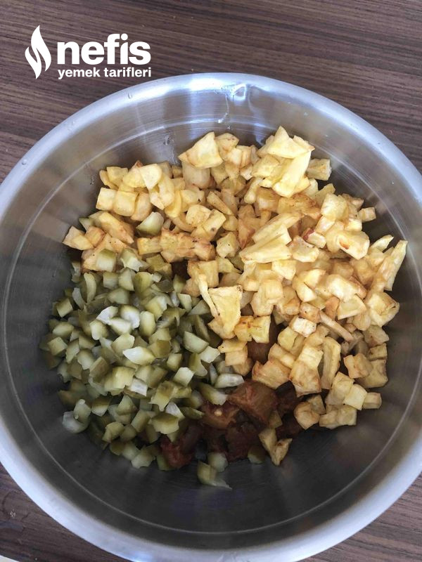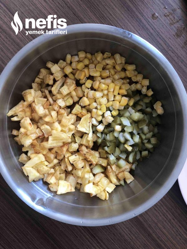 - Salata materyallerini hazırlamaya başlayalım küp küp doğranmış kavrulmuş patlıcan tekrar patates doğranmış salatalık turşusu doğranmış mısır doğranmış dereotu ve kuru soğanı hepsini bir kaba alıyoruz.