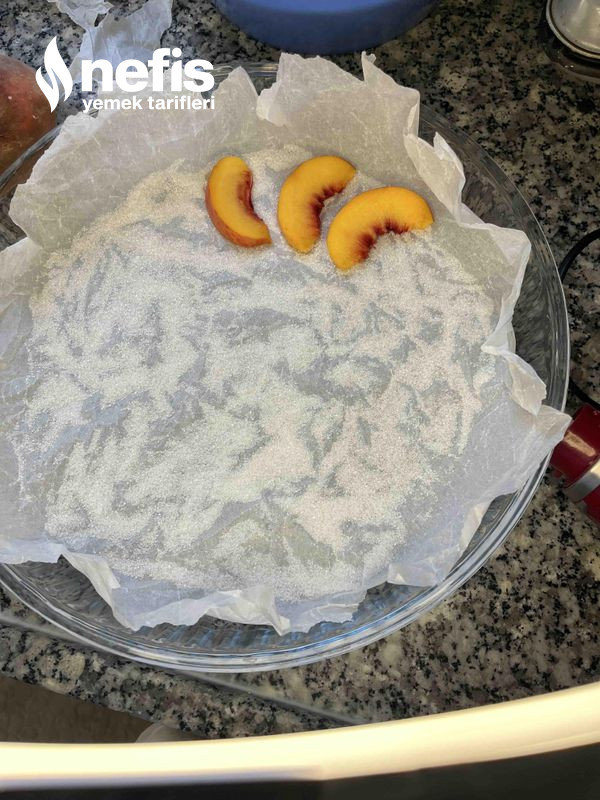 4. Ben geniş ve yuvarlak borcama yağlı kağıt serdim fazla gelen kenarlarını kestim üzerine şeker ekledim onun da üstüne şeftalileri dizdim.