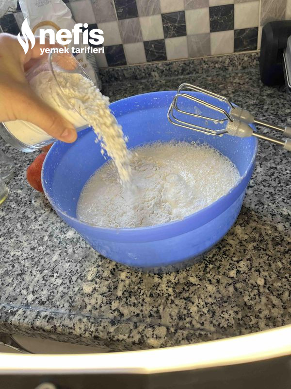 2. Daha sonra sırasıyla süt,yağ,su ve unu içine koyalım.