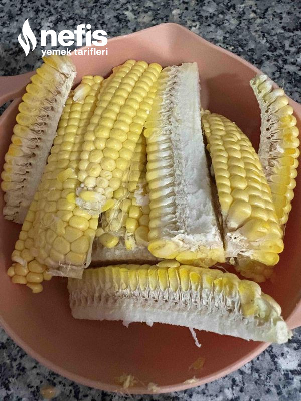 1. Mısırları evvel ortadan ikiye bölüyoruz. Sonra bu modülleri uzun 4 kesime ayırarak toplamda 8 modül mısır elde ediyoruz.