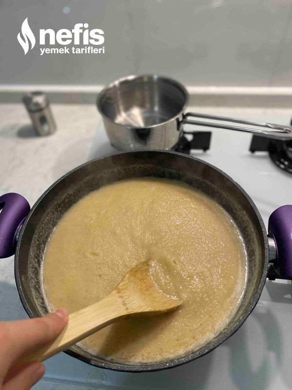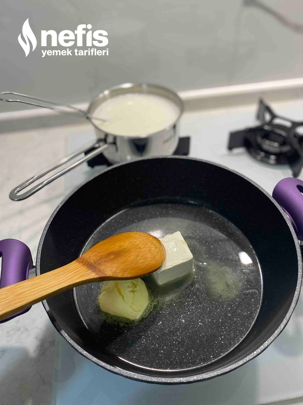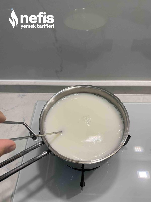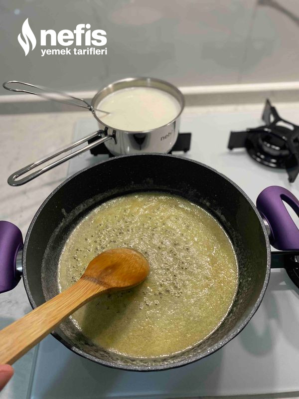 1. Önce tatlının şerbetini hazırlayalım. Tencereye su şeker ve sütü ek edip şeker eriyene kadar çırpıcıyla karıştıralım. Kaynamayacak yalnızca şeker eriyene kadar ocakta tutacağız.