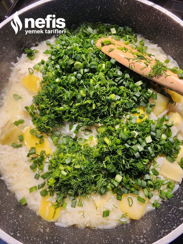- Pilav suyunu çekince ince ince kıyılmış dereotu ve yeşil soğan eklenerek karıştırılır ve servis edilir. Afiyet olsun.