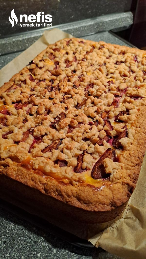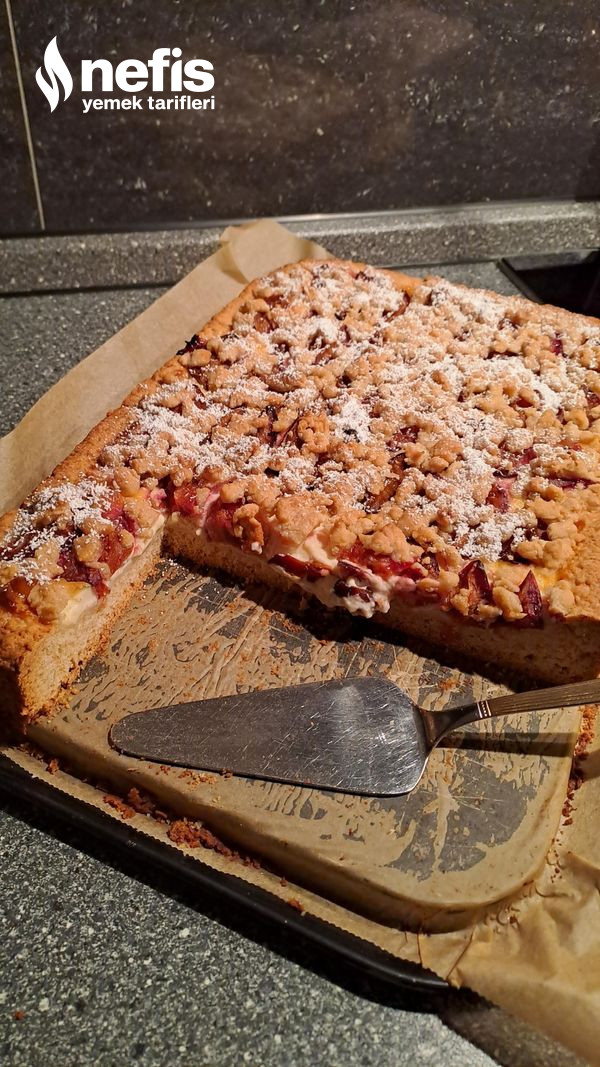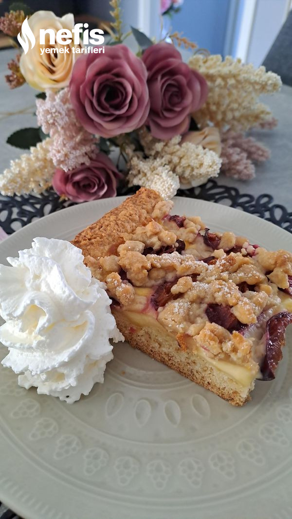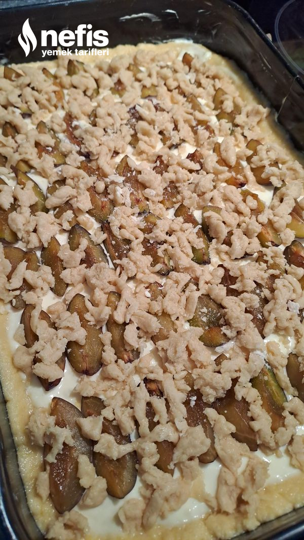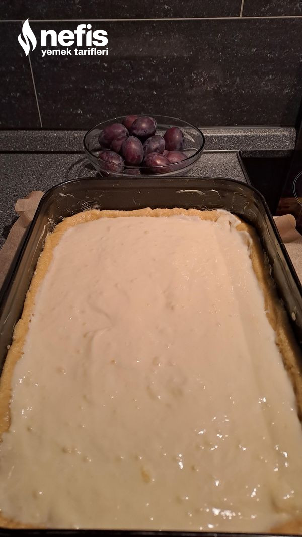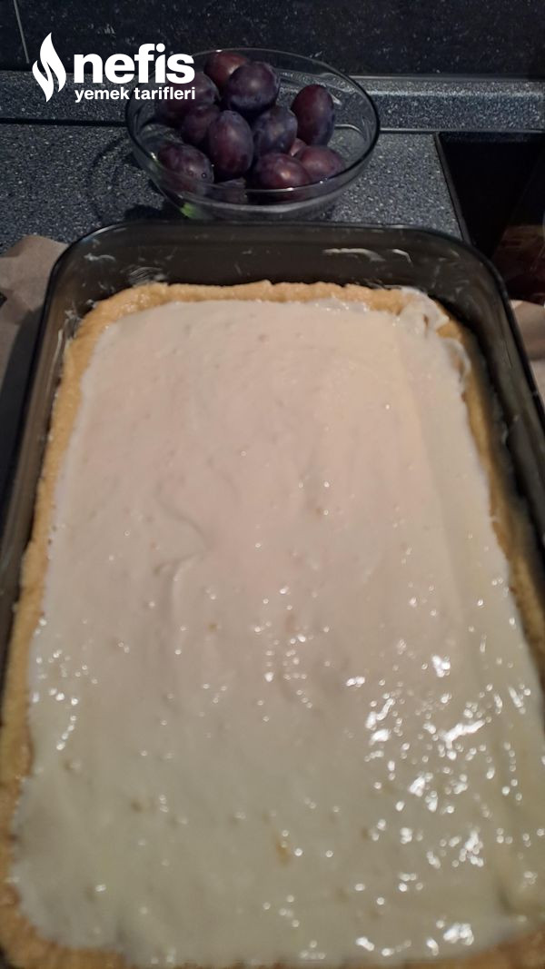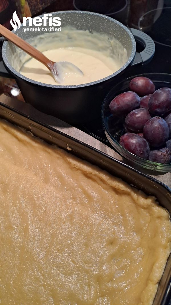 - Kalıba yerleştirdiğimiz hamurumuzun üzerine puding karışımımızı gezdirip düzlüyoruz ve yıkayıp, dörde kesilmiş eriklerimizi pudingimizin üzerine diziyoruz.