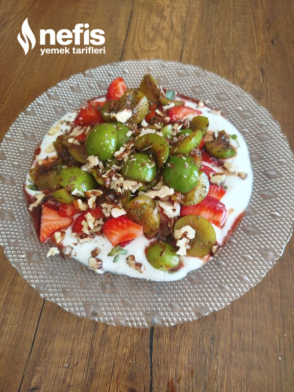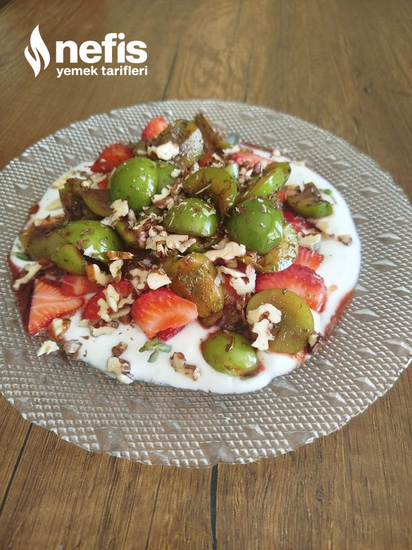 - Üzerine çilekler ve eriği sosu ile birlikte koyalım birazda ceviz ekleyip servise hazır.