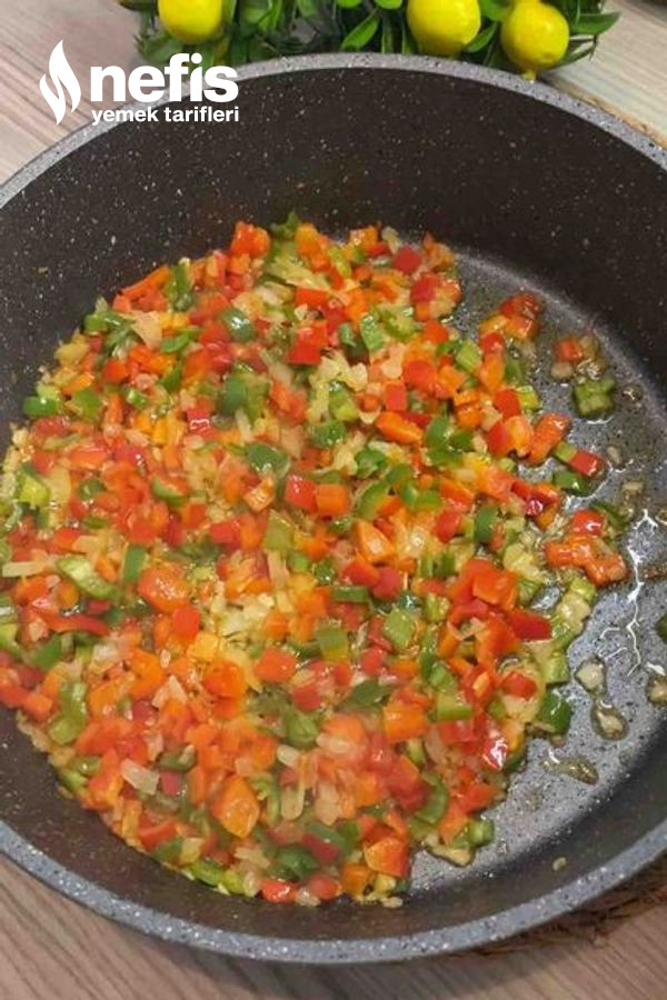 - Tencerede evvel soğanı, akabinde biberleri sırayla kavurdum. Marine ettiğim etleri ekledim.