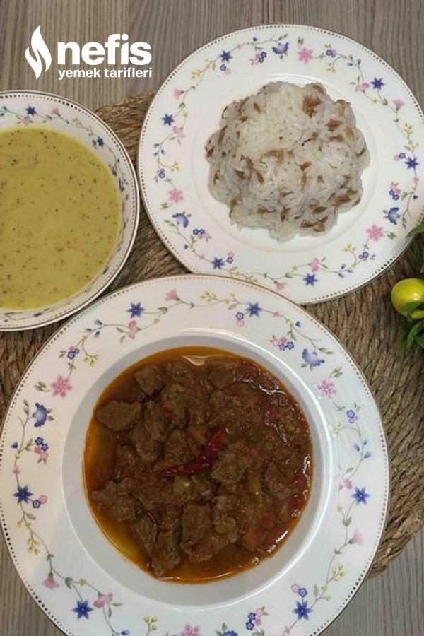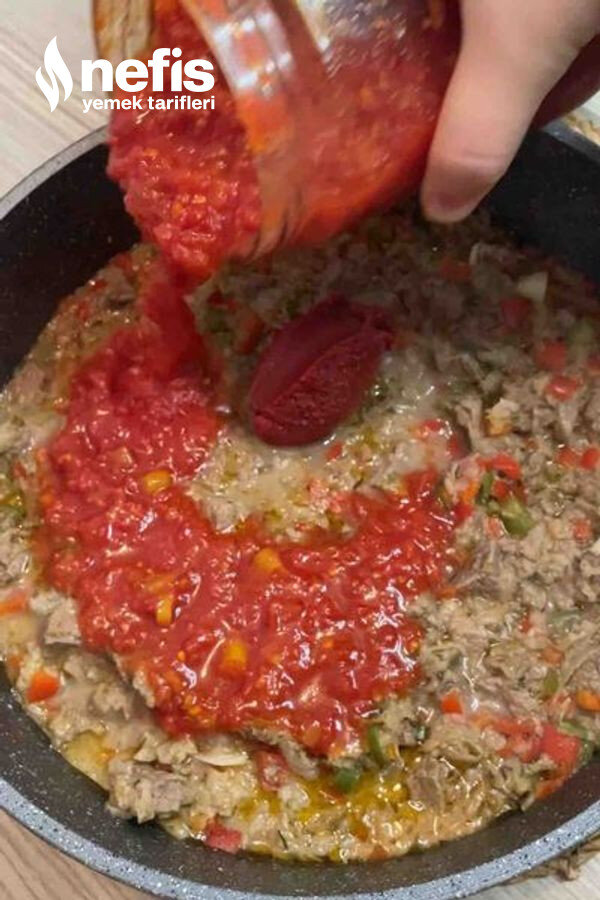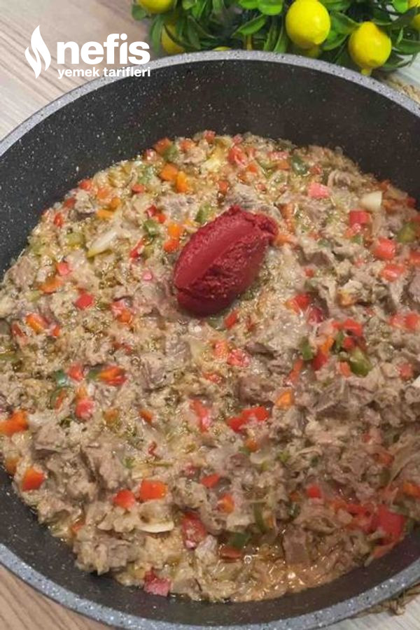 - Etler suyunu salınca domates salçasını ve sıcak suyu ekledim. Kapağını kapatıp suyunu çekene kadar pişirdim.