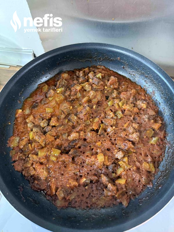 5. Kısık ateşte pişirme: tavanın kapağını kapat, kısık ateşte etler yeterlice yumuşayana kadar pişir (yaklaşık 15–20 dakika).