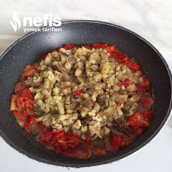 - Uygun bir tavaya zeytinyağını alıp doğradığımız biber ve patlıcanları ek edelim karıştırarak 5-6 dakika pişirelim.