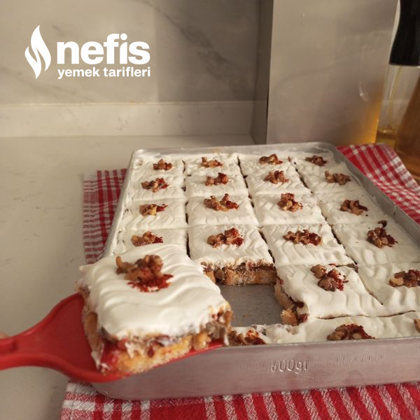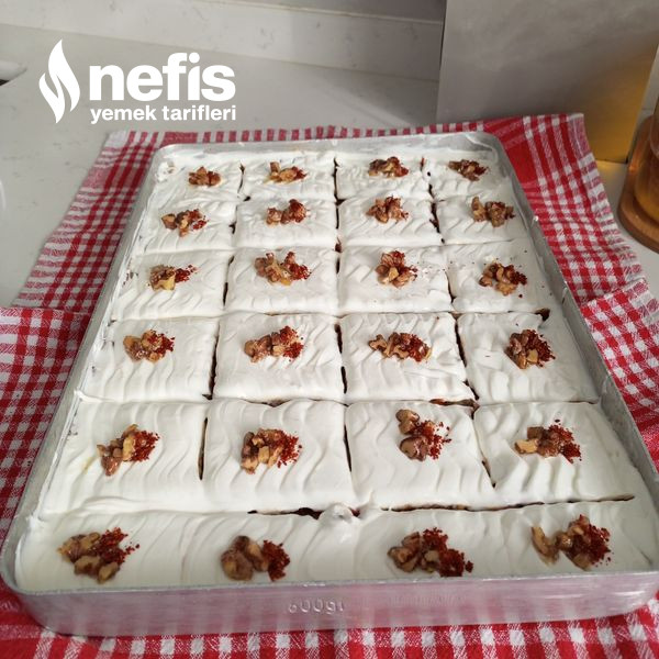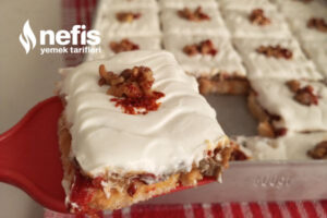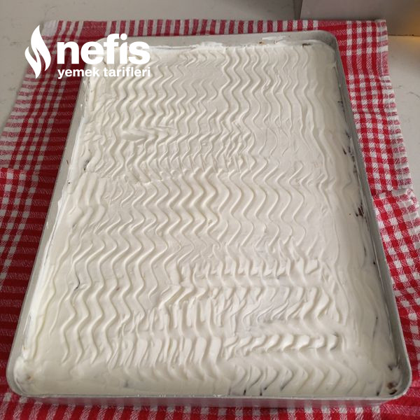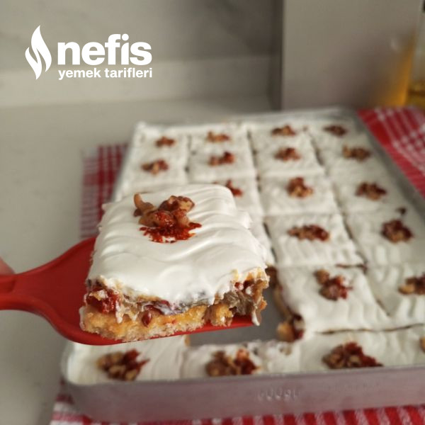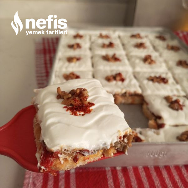 - Bir kasede yoğurt mayonez sarımsak ve tuzu güzelce çırpalım ve bekleme müddetinin sonunda hazır olan salatanın üzerine düzgün bir biçimde yayalım.