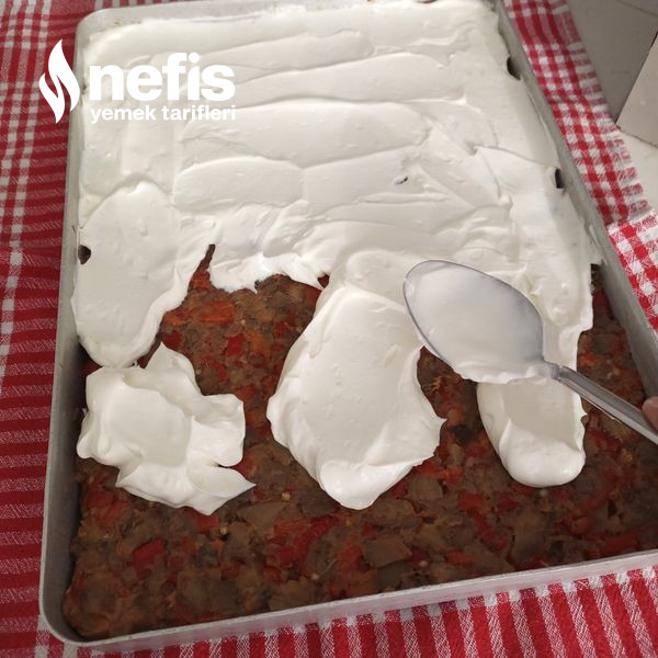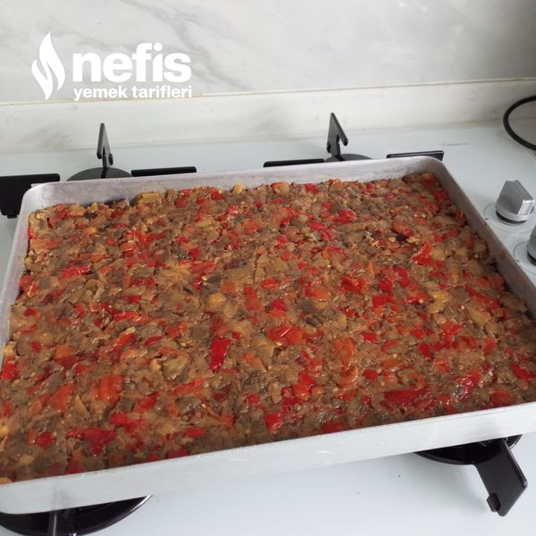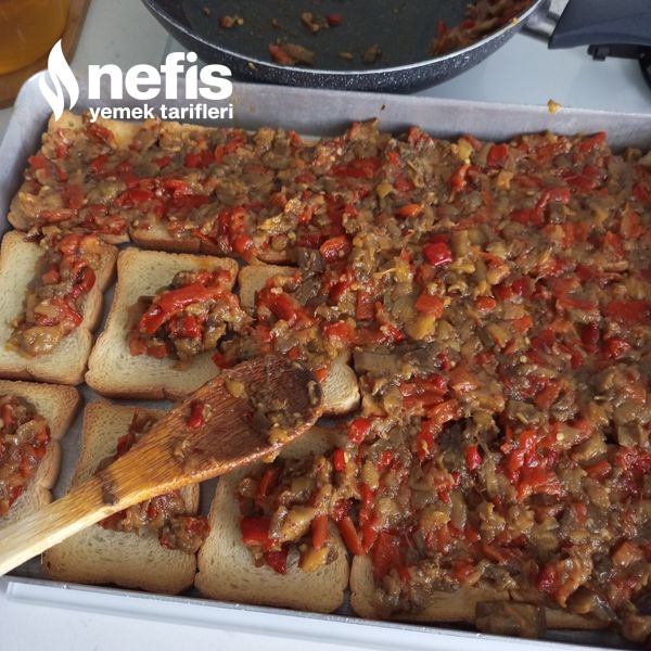- Uygun bir tepsiye etimekleri yan yana dizelim hazırladığımız patlıcan biber harcını ocağı kapatıp kapatma sıcak olarak etimeklerin üzerine güzelce yayalım.