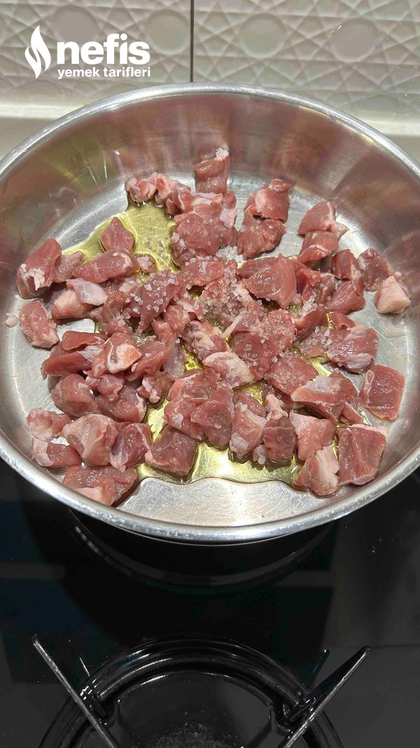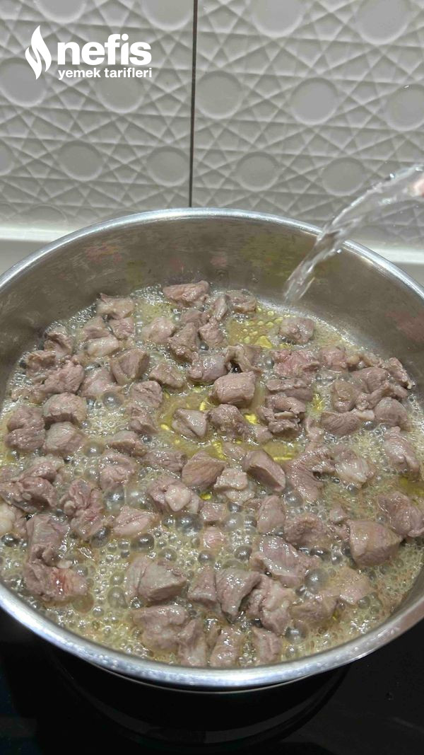 3. Pembe desen etlerimizin üzerine bir su bardağı suyumuzu dökelim ocağın altını kısıp suyunu çekesiye kadar bekleyelim.